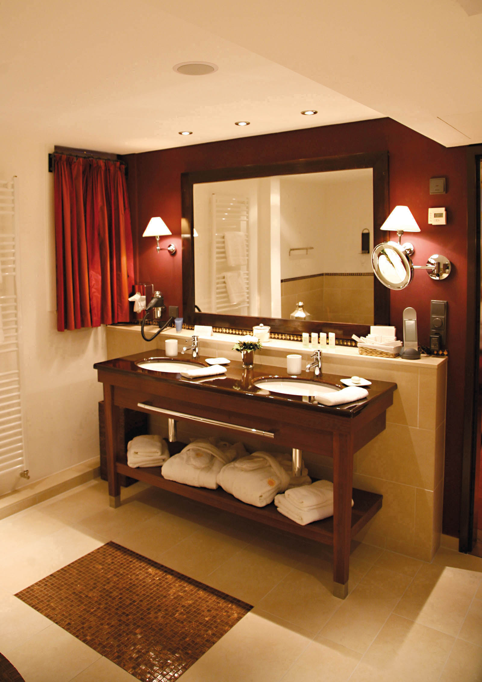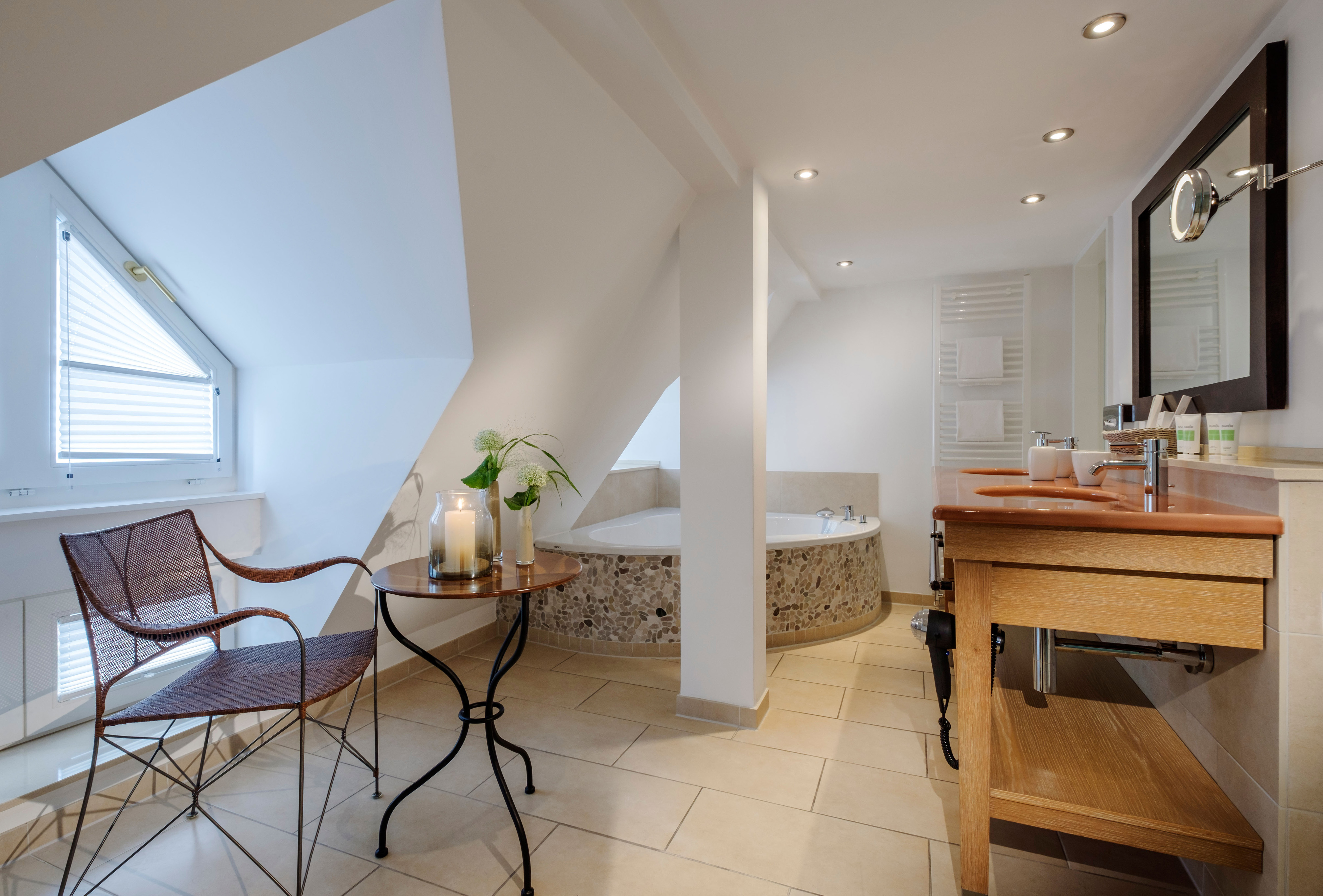 Geïntegreerde woonslaapkamer met hoogwaardige uitrusting en warme kleuren. Badkuip en douche, minibar, airco en gratis WiFi.